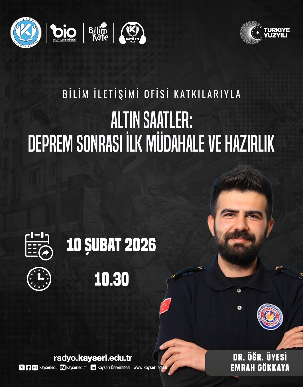 Kayseri Üniversitesi Bilim İletişimi Ofisi katkılarıyla KAYÜ FM’de yayınlanan programda, 6 Şubat depremlerinin üçüncü yıl dönümünde “Altın Saatler: Deprem Sonrası İlk Müdahale ve Hazırlık” konusu ele alındı.