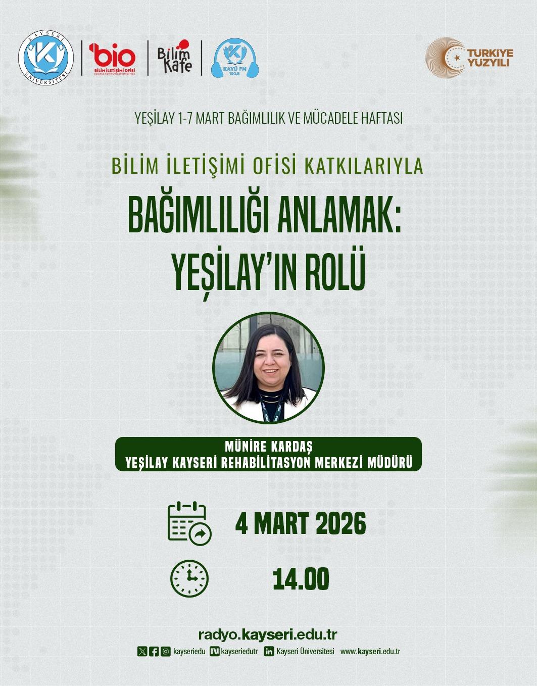 Yeşilay Kayseri Rehabilitasyon Merkezi’ne başvuru süreci hakkında da bilgi verildi. Başvuruların çeşitli sağlık kuruluşlarının yönlendirmesi ile sağlandığı ifade edildi. Tedavi süresinin kişiden kişiye değiştiği, bağımlılığın türü, süresi ve kişinin psikososyal durumuna göre farklılık gösterdiği belirtildi. Merkezde yürütülen programların; bireysel psikolojik danışmanlık, grup terapileri, sosyal uyum çalışmaları ve rehabilitasyon temelli destekleri kapsadığı aktarıldı. Aynı zamanda tedavinin taburculukla sona ermediği, danışanların belirli aralıklarla takip edildiği ve yeniden başlama riskine karşı destek sürecinin sürdürüldüğü de vurgulandı.